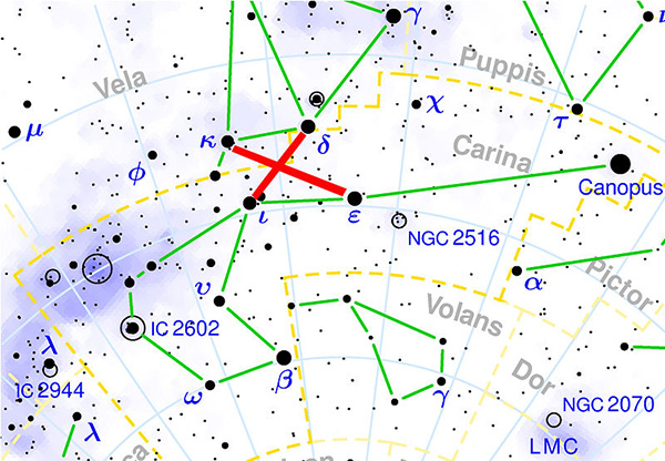 Астеризм с устоявшимся историческим названием – созвездие Ложный Крест, расположенное в Южном полушарии. В него входят всего четыре звезды, но достаточно яркие, образующие узнаваемую форму хорошо различимого креста.