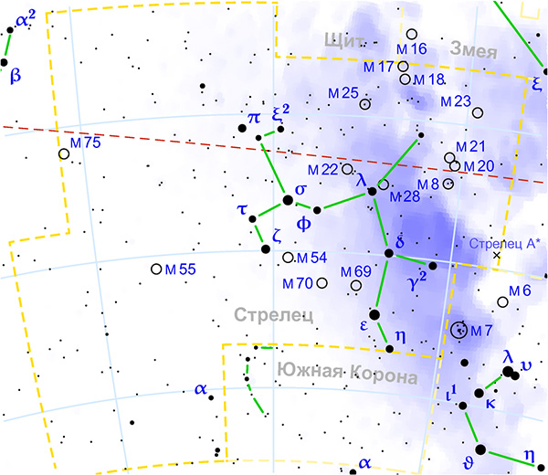 В созвездии Стрельца расположены настоящие космические ясли – тройная туманность, являющаяся местом активного появления новых звезд. Объект знаменит в первую очередь тем, что объединяет сразу три типа туманностей, обеспечивающих захватывающий разноцветный пейзаж, освещенный ярким светом молодых рождающихся звезд. Эти типы туманностей: